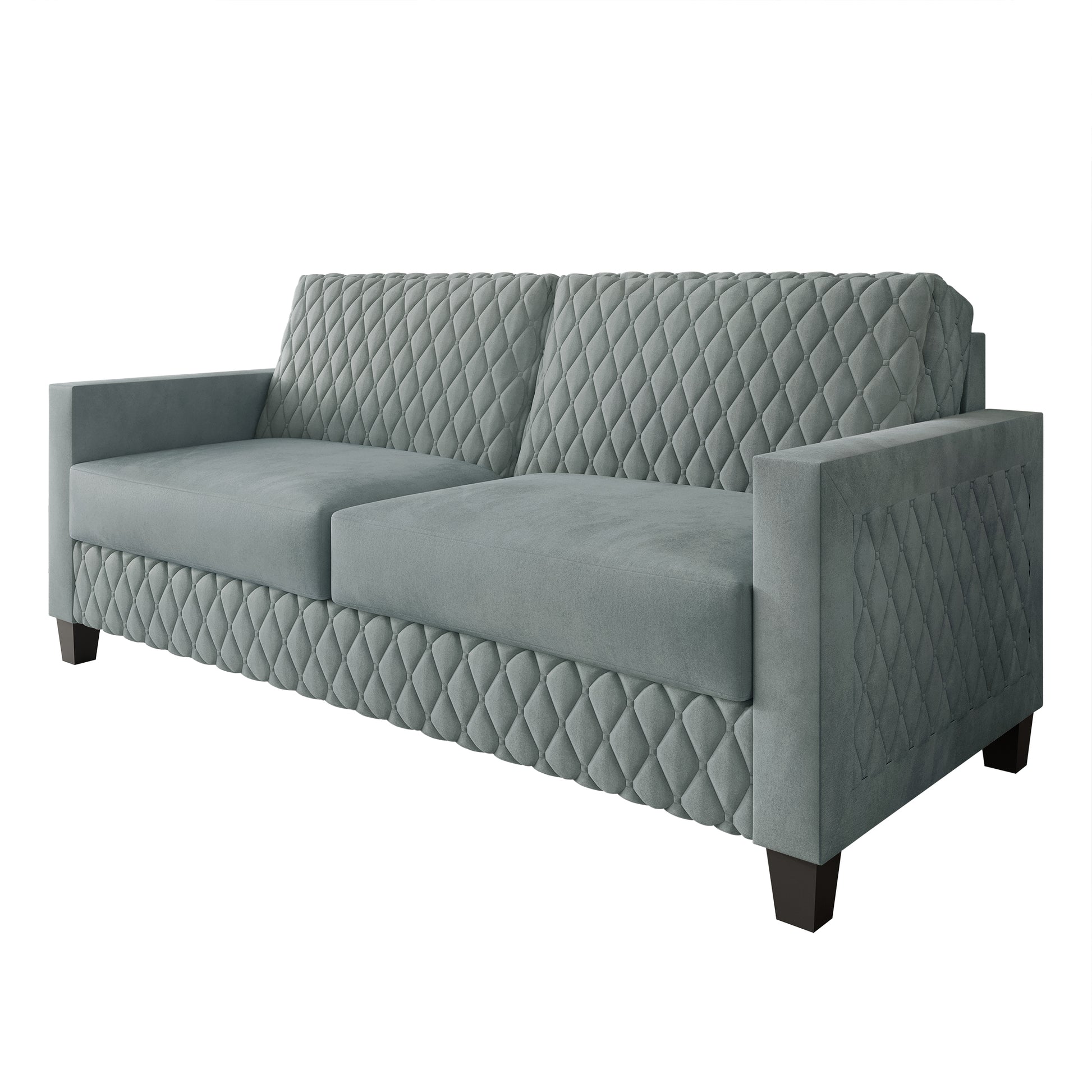 Enhance your living area with our contemporary loveseat! Our modern design provides ample seating without overcrowding your room. With a geometric diamond line design for elegance and a smooth reclining surface, this loveseat comfortably accommodates up to 2.5 people. Enjoy exceptional comfort with foam-padded cushions and 100% polyester shiny velvet upholstery. Crafted from durable solid wood and supported by black plastic legs, it's available in Grey, Beige, Light Blue, and Red. Easy assembly required; shipped in one box.
