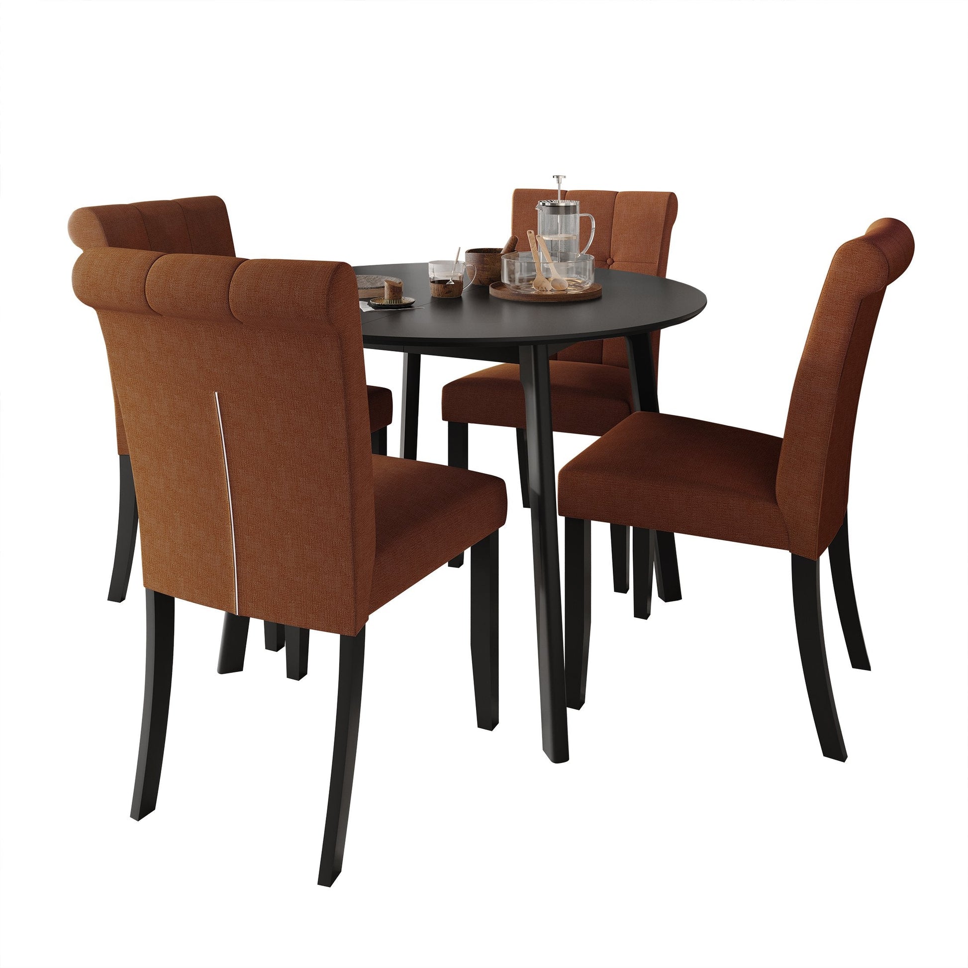 Revitalize your dining area with this chic set featuring a 42-inch round table and four stylish chairs. The table sleek black finish and wood-veneered MDF construction combine durability with elegance, while its two-piece design simplifies transportation and setup. Each chair is designed for comfort with a plush cushion seat and ergonomic backrest, supported by solid wood legs for stability. Upholstered in 100% linen, the chairs are available in striking colors Green, Grey, Orange, and Teal. Delivered in three boxes with easy-to-follow assembly instructions, this dining set seamlessly blends sophistication with functionality for your home
