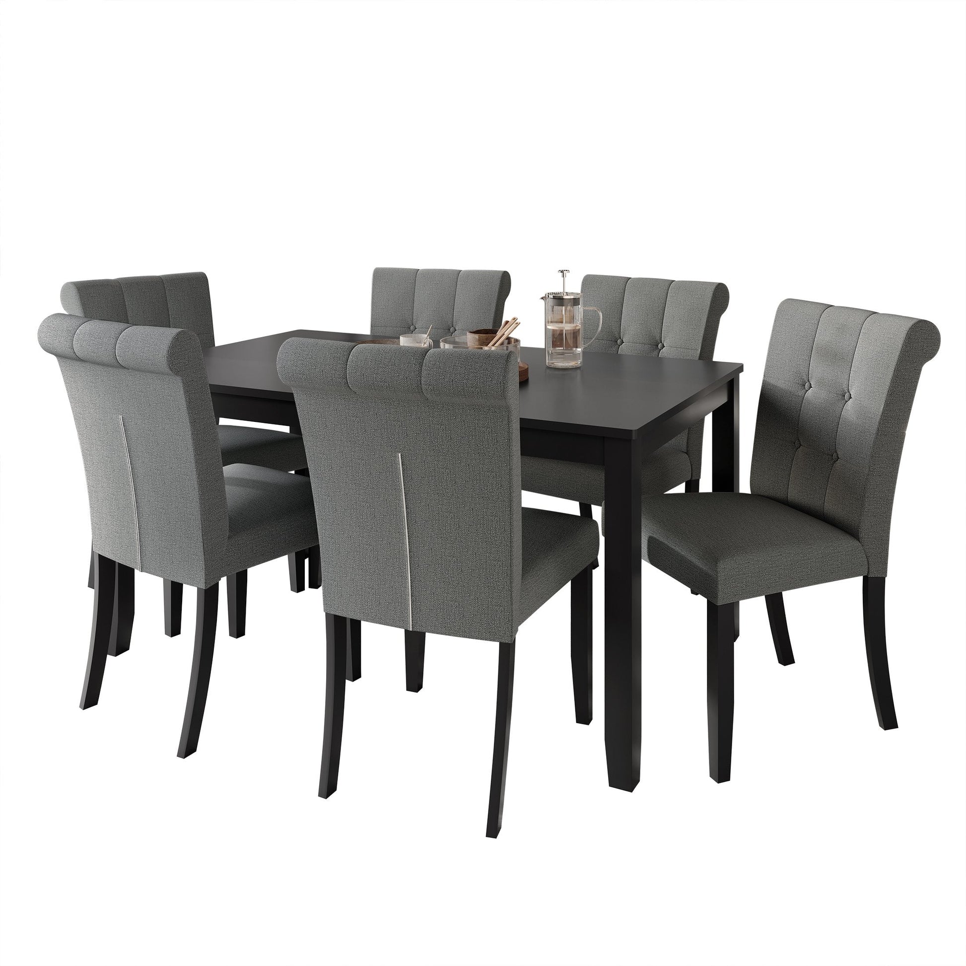 - This set includes a 59-inch rectangular table and six upholstered chairs, offering ample seating and style for your dining space
