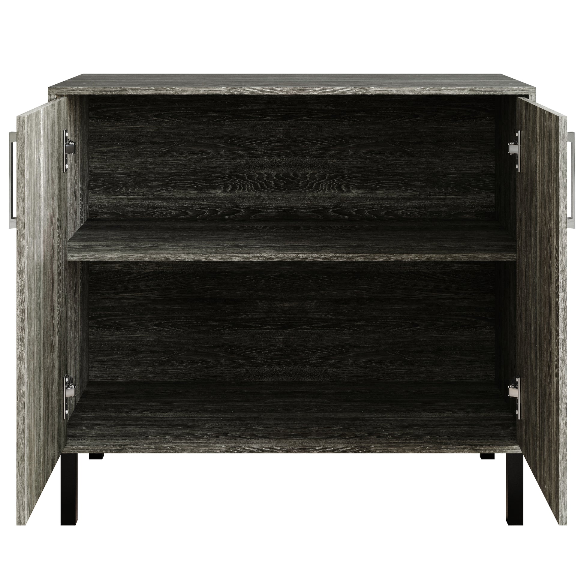 This versatile cabinet is the perfect blend of modern design and practical storage. Featuring two spacious shelves and a wide top surface, it's ideal for storing belongings or showcasing decorative pieces. The two door cabinets with transparent acrylic panels offer a stylish way to display your items, while the round black handles complete the sleek, contemporary look. Made from durable engineered wood with a sturdy veneer finish, the cabinet is supported by four metal legs for lasting stability. Available in Black, White, Dark Grey, and Light Oak, it's easy to assemble and ships in one compact box