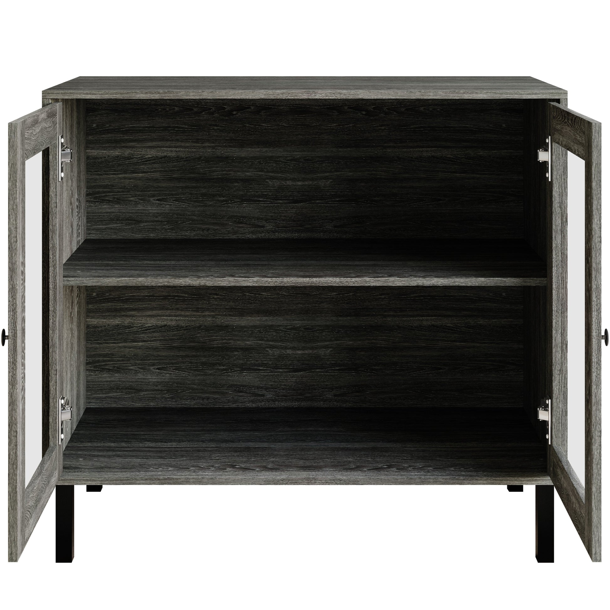 This versatile cabinet is the perfect blend of modern design and practical storage. Featuring two spacious shelves and a wide top surface, it's ideal for storing belongings or showcasing decorative pieces. The two door cabinets with transparent acrylic panels offer a stylish way to display your items, while the round black handles complete the sleek, contemporary look. Made from durable engineered wood with a sturdy veneer finish, the cabinet is supported by four metal legs for lasting stability. Available in Black, White, Dark Grey, and Light Oak, it's easy to assemble and ships in one compact box