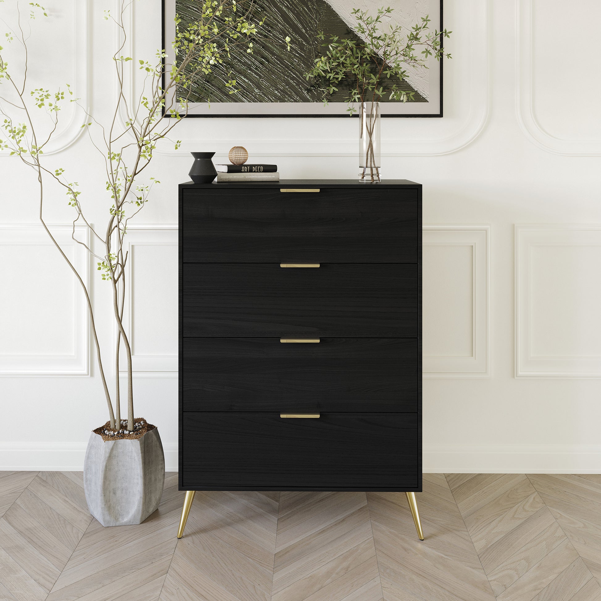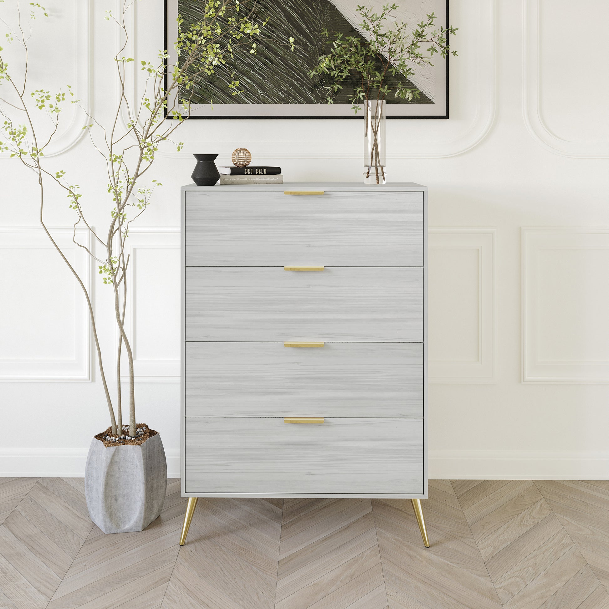 Elevate your space with our Four-Tier Wooden Chest, a harmonious blend of form and function. This exquisite piece features four tiers of wooden drawers, each equipped with pre-assembled metal slides, guaranteeing smooth and hassle-free operation. Supported by four elegantly golden metal legs, it not only adds stability but also enhances the enduring durability of this timeless and evergreen furniture. The classic gold drawer handles provide an elegant finishing touch, adding a touch of sophistication to the overall design. Constructed from a combination of solid wood and engineered wood, this chest offers the perfect marriage of strength and resilience. The generously spacious drawers effectively conceal clutter, creating a neat and organized look in your space. Assembly is a breeze, thanks to the included sorting hardware pack and assembly instructions. Plus, the entire package conveniently ships in one box, streamlining the delivery process. Choose from a selection of classic colors - Black, White, Silver, and Light Grey - to seamlessly match your decor. Maintenance is easy, making this drawer a practical and stylish addition to your home.