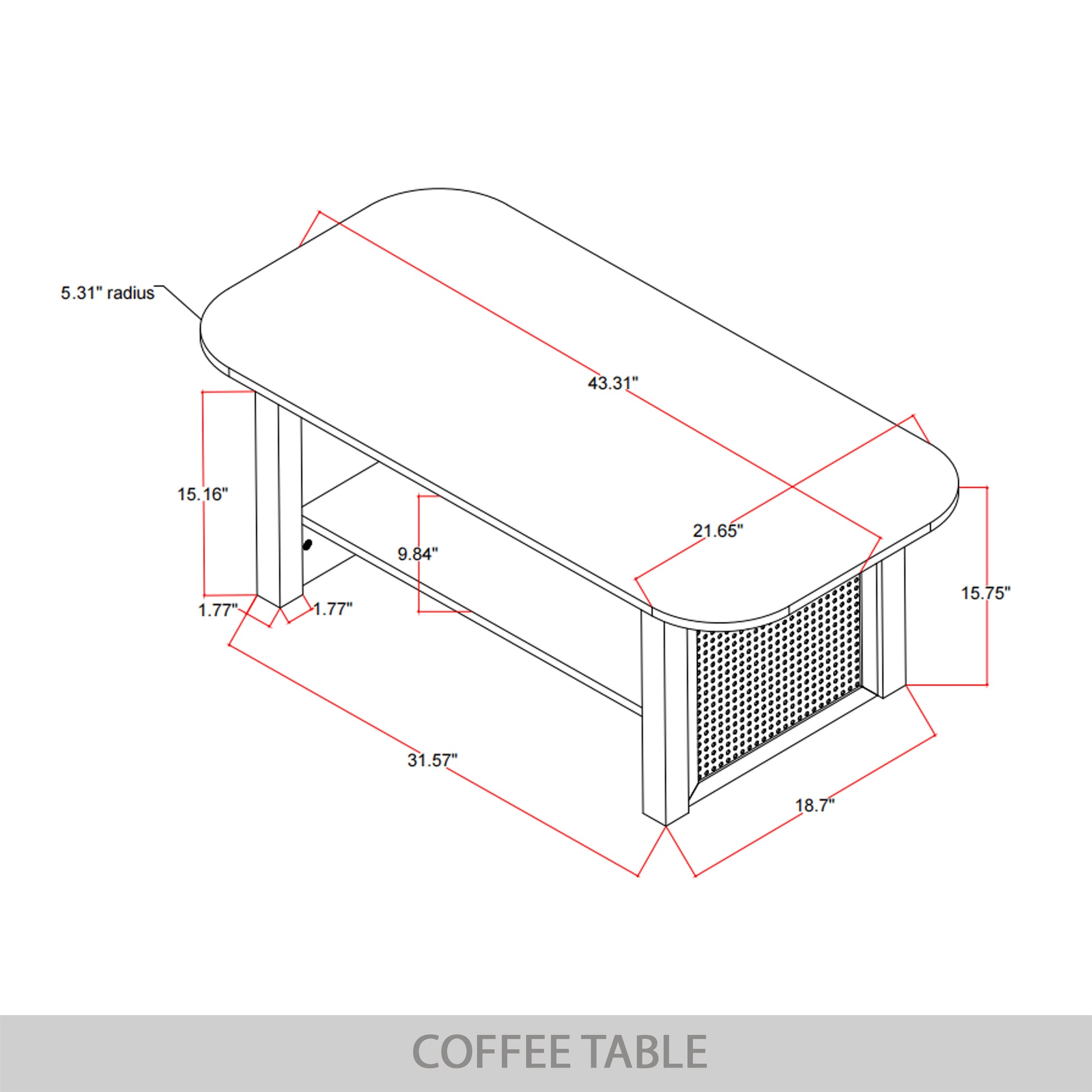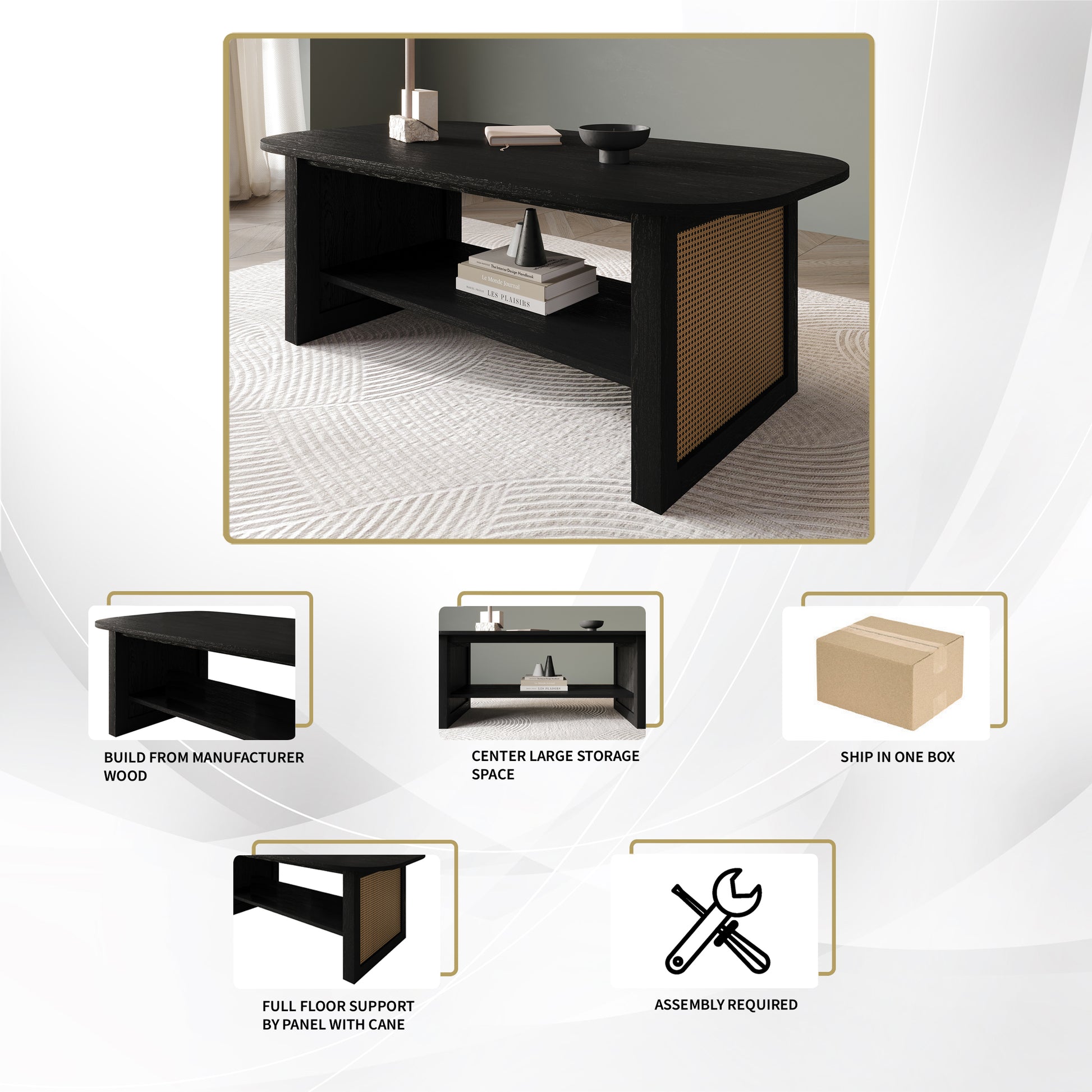 Elevate your living space with our exquisite coffee table. Boasting sleek and clean aesthetics, this coffee table is adorned with a sophisticated black finishing and chic cane panel design, adding a touch of modern elegance to any room. The curved tabletop design offers a unique and distinctive aesthetic, while sturdy cane panels ensure full floor support. With a spacious central storage area, conveniently store your essentials within arm's reach. Shipped in one box, assembly is easy with clear instructions provided for a hassle-free setup